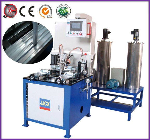 This equipment has two main functions: inject the raw materialinto the groove of aluminum profiles, when the material cured, cut off the bridge; Then, the aluminum profiles obtain the functions such as heat insulation, etc. (The raw material is thermal insulation material, the glue)