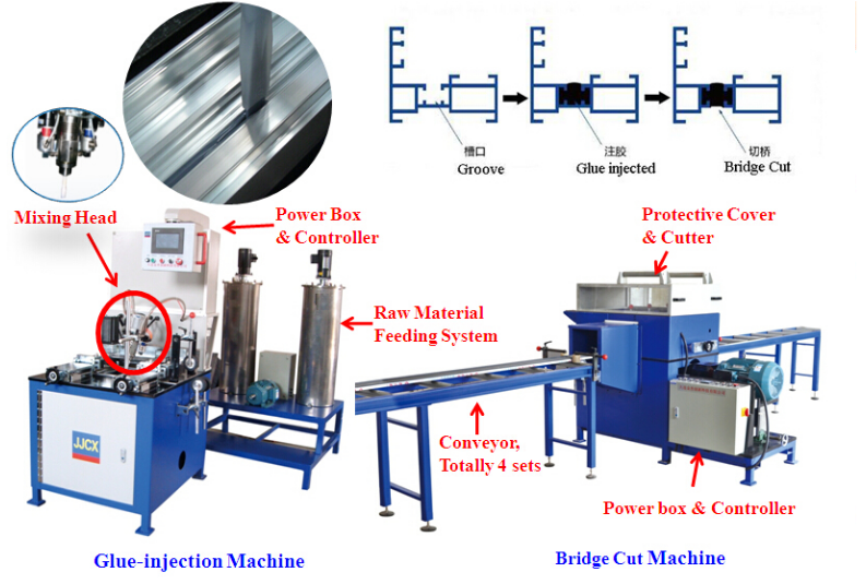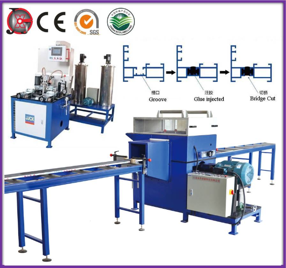 This equipment has two main functions: inject the raw materialinto the groove of aluminum profiles, when the material cured, cut off the bridge; Then, the aluminum profiles obtain the functions such as heat insulation, etc. (The raw material is thermal insulation material, the glue)