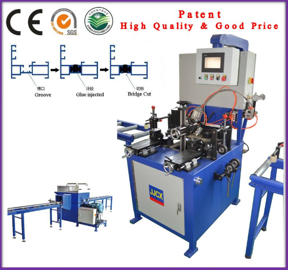 This equipment has two main functions: inject the raw materialinto the groove of aluminum profiles, when the material cured, cut off the bridge; Then, the aluminum profiles obtain the functions such as heat insulation, etc. (The raw material is thermal insulation material, the glue)